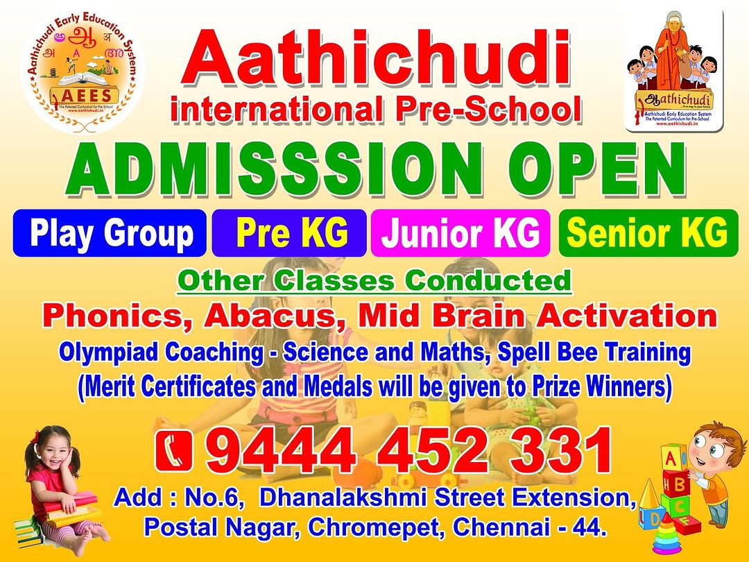 Aathichudi is a play school initiative by a group of three IT enthusiasts, who has the vision and passion to redefine the way, the child education system perceived in India. On continuous research into the realm of Play School/Pre School methods followed worldwide, we realized that most of the leading brands in this industry were not providing a platform to develop the inherent but undeveloped talent that was hidden within each child. This very reason provoked us to develop a preschool system that concentrates on an overall holistic development of a kid – “Aathichudi”. Our system combines the best of both extremely different systems, the Western Montessori and the Indian Gurukula System.