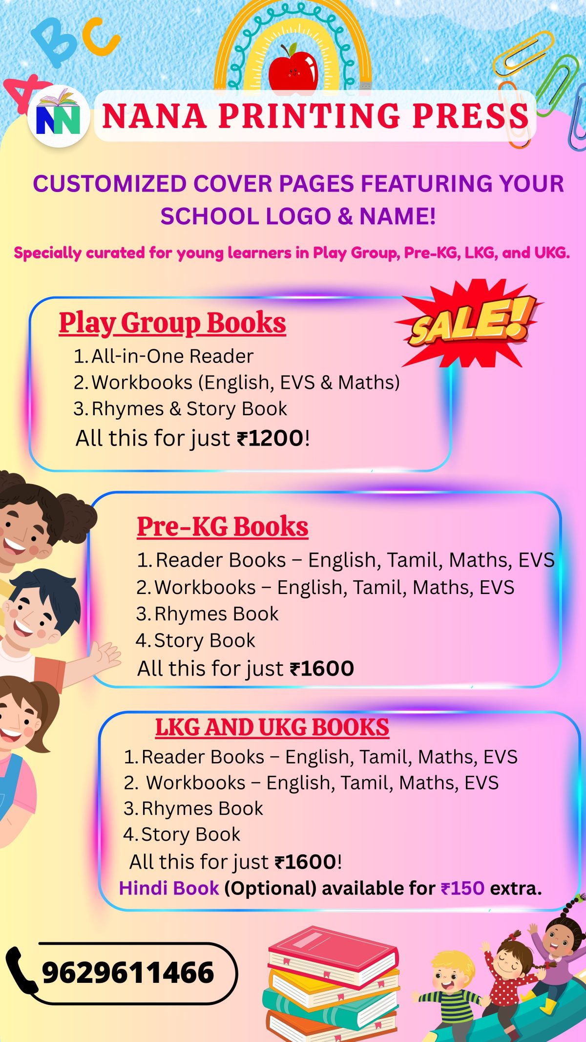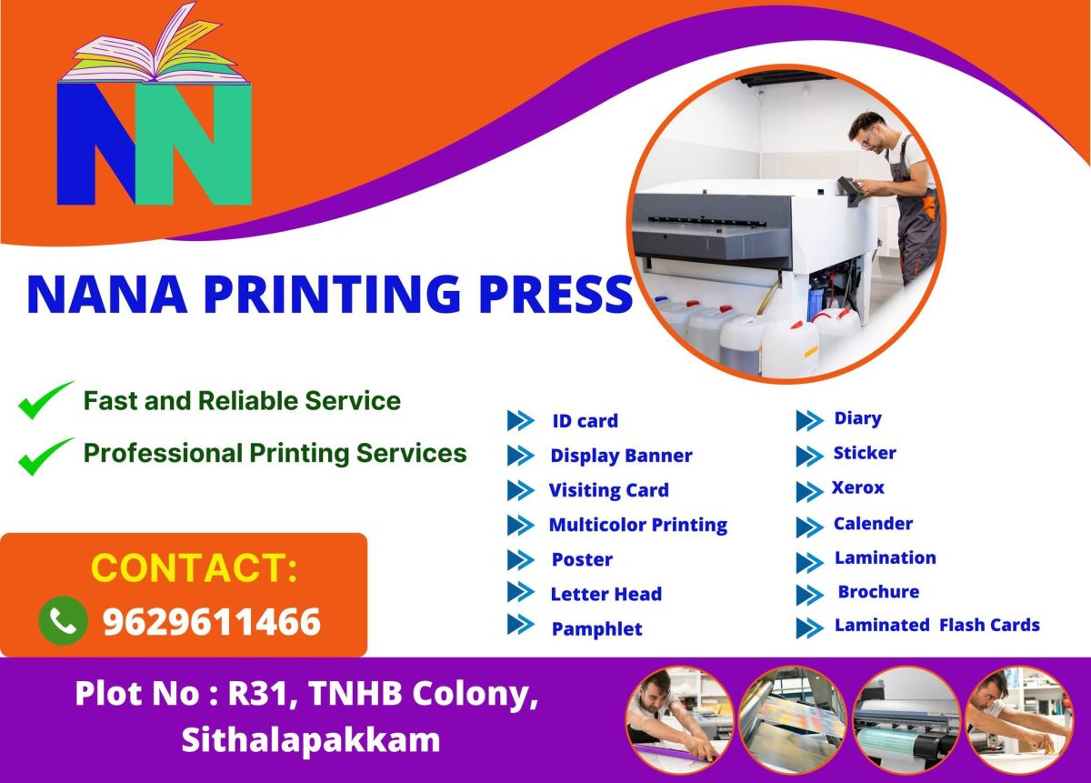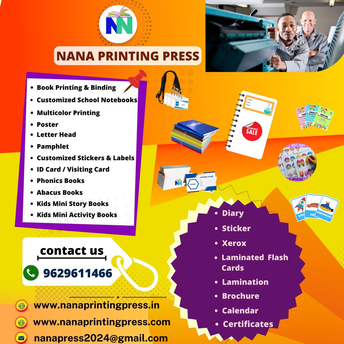 Nana Printing Press is dedicated to helping businesses, schools, and individuals bring their visions to life through print. Our team focuses on quality, detail, and customer satisfaction, making us the preferred choice for printing services in the region. At Nana Printing Press, we turn ideas into print. Our services include visiting cards, flyers, posters, banners, catalogues, school materials, packaging boxes, and teaching aids. We combine creative design with precision printing to deliver products that leave a lasting impression.